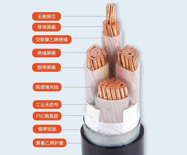 电力电缆的保护层分内护层和外护层两部分。内护层主要是保护电缆统包绝缘不受潮湿和防止电缆浸渍剂外流以及轻度机械损伤;所用材料有铅包、铝包、橡套、聚氯乙烯套和聚乙烯套等。外护层是用来保护内护层的,防止内护层受机械损伤或化学腐蚀等,包括铠装层和外被层两部分。所用材料,一般铠装层为钢带或钢丝,外被层为纤维绕包、聚绿乙烯护套和聚乙烯护套。